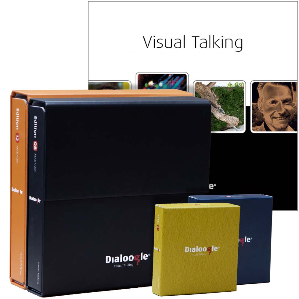 Billedserierne Editions kan bruges til alle formål. Den eneste forskel på serierne er motiverne, men alle er udvalgt efter de samme principper for sammensætningen af en Edition. Alle billedserier er unikke, og ingen motiver anvendes i mere end én Edition. Du kan vælge de Editions, du synes bedst om. Dog kan du aldrig forvente, at motiverne taler til andre på samme måde, som de taler til dig. Dialoogles mission med disse billedserier er ikke at levere konkrete billeder af et svar – men at stimulere hjernen til at finde vej til et svar. Det motiverer til refleksion og fantasi at bruge motiverne kreativt og metaforisk. Motiverne giver således mere nuancerede og velovervejede svar. De, som lytter, får samme visuelle reference, og det styrker forståelsen mellem deltagerne. – Ønsker du, at motiverne helt konkret skal kunne udtrykke svar, så kan du udvælge billedkort til formålet fra flere Editions.